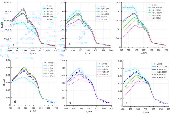 The results of modeling the Rrs(λ) spectra with Hydrolight software with a change in the values of Zcoc (a,d), Chl (b,e), and CDOM (c,f) using data from stations 1_22 (upper row) and 3_17 (bottom row). The notation Chl/CDOM ‘X’ refers to the case of an X-fold increase in the concentration of Chl or ag(443).
