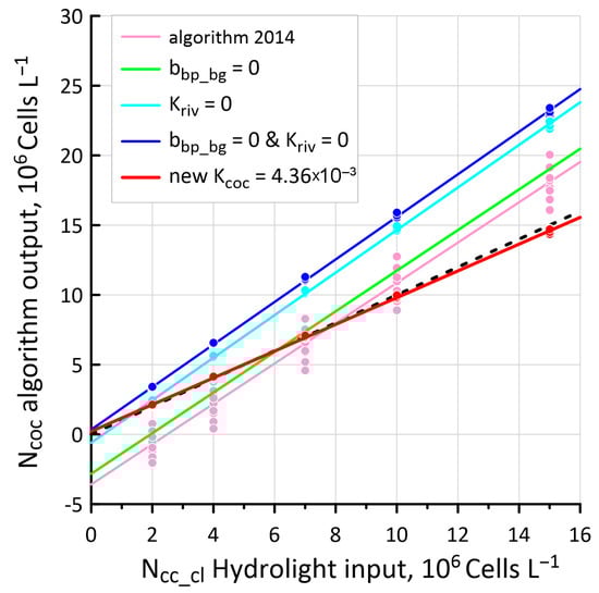 Thus, 45 Rrs spectra were obtained, to which the regional algorithm was applied to estimate the Ncoc concentration. The comparison of the Ncc_cl input values used in Hydrolight calculations and obtained Ncoc estimates is shown in Figure 4. If we use the values of the parameters Kcoc, Kriv, and bbp_bg defined in the article [], then the Ncoc estimates (shown in pink circles) vary visibly in response to changes in the content of the OAC. Simultaneously, overestimated Ncoc evaluations are obtained for Ncc_cl = 15 × 106 Cells L−1, and underestimated ones (in a number of cases even negative) for Ncc_cl = 2 × 106 Cells L−1. This result arises from the fact that in our Hydrolight model, the contribution of terrigenous suspended matter is not taken into account. The origin of this matter is associated with river runoff, as well as with the bbp background amount, which is parametrized through the bbp_bg value. Therefore, Ncoc estimates were calculated for the case of Kriv = 0 and bbp_bg = 0 (blue circles in Figure 4). In this case, the influence of the OAC practically disappears, but for all Ncc_cl data, overestimated Ncoc values are obtained, and this overestimation increases in direct proportion to Ncc_cl, which indicates an incorrect Kcoc value. For the best correspondence of the initial values Ncc_cl with the results of Ncoc estimates, the value 4.36 × 10−3 is used (red circles in Figure 4).