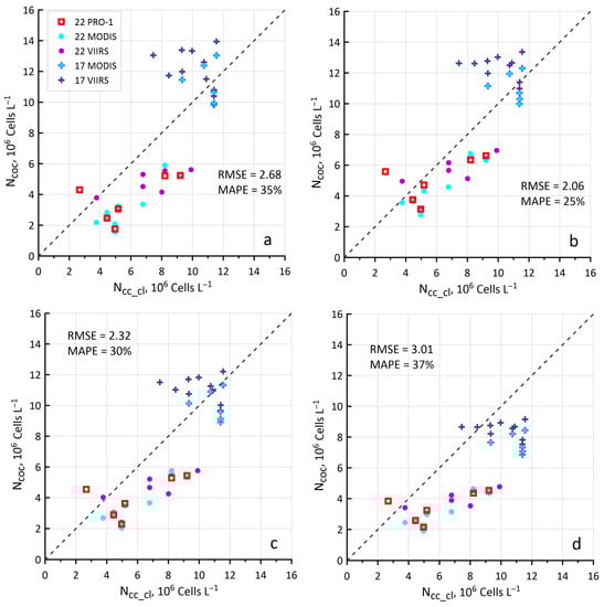 Comparison of the coccolithophore concentration Ncoc calculated from Rrs(λ) with different parameters of the regional algorithm Kcoc, Kriv, and bbp_bg, and measured Ncc_cl: (a) algorithm 2014 (1.0_1.0, Kriv = 2.74 × 10−3); (b) option “10%” (0.1_0.1, Kriv = 3.52 × 10−3); (c) option “50%” (0.5_0.5, Kriv = 3.52 × 10−3); (d) option “10% 2017” (0.1_0.1, Kriv = 5.13 × 10−3). Notations are the same as in Figure 2.