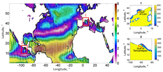 Average QuikSCAT wind velocity for 2000–2009. The color bar shows wind speed in m/s. Red rectangles show areas of Mistral winds (1) and Tehuantepec winds (2), in which zoomed maps are shown on the right. In zoomed maps, near coastal water depths are shown in m, and boundaries of Landsat-8 scenes are shown with red contours.
