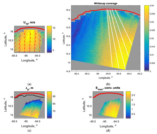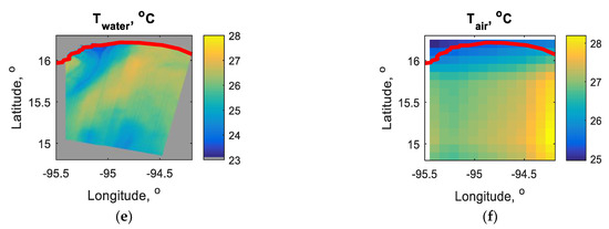 Figure 3 and Figure 4 show the source data of our study: the wind speed, U, and wind direction at the height of 10 m, the fraction of sea surface coved with whitecaps, W, the wavelength of spectral peak waves, , the values of spectral maximum, , water, and air temperatures for two considered scenes. Empty pixels in the maps correspond to areas excluded from analysis due to cloud impact or proximity to the shoreline. As the spatial resolution of the image was 30 m, we obtained only wavelengths of dominant waves longer than 60 m. Thus, wavelength measurements are absent in areas close to the shoreline, where the length of developing waves is less.