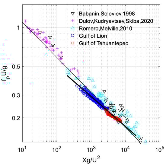 with a coefficient of determination . Coefficients in (10) were least square-approximated using the logarithms of the data. The obtained value of n falls into the range of the estimations known in the literature [20,48,58]. Using (5), we come to dependencies of on dimensionless spectral peak frequency and wave age: