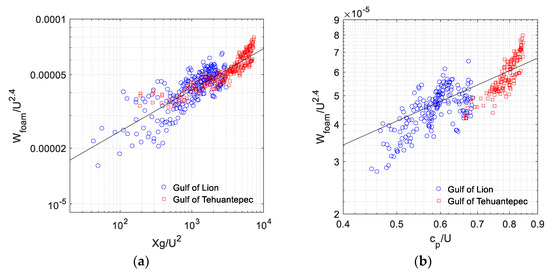 Figure 3b and Figure 4b show that the wind blow splits into several thin jets. It is more evident in Figure 4b, where no atmospheric internal waves are presented. It can be expected that wave development along such jets is the closest to classical ideas (1) and (2) on wave growth from the shore. Using visual inspection of W fields, we selected sections matching thin wind jets and crossing the areas of wavelength measurements. We selected four sections in the Gulf of Lion (see Figure 3b) and five sections in the Gulf of Tehuantepec (see Figure 4b). Further analysis was conducted only for these sections. Although wave development laws imply the wind blowing perpendicular to the shoreline, Ardhuin et al. [4] argued that slanting fetch does not affect wave development, at least when wave direction relative to the normal to the shoreline does not exceed 30 degrees. As classical representations (1) and (2) imply the spatially uniform wind velocity [1,2], the wind speed is commonly averaged to be used in wave development analysis [5,7,53]. The wind velocities averaged over all sections are m/s and m/s for the Gulf of Lion and the Gulf of Tehuantepec, respectively. Further, these constant values were used to analyze wave and whitecap development.