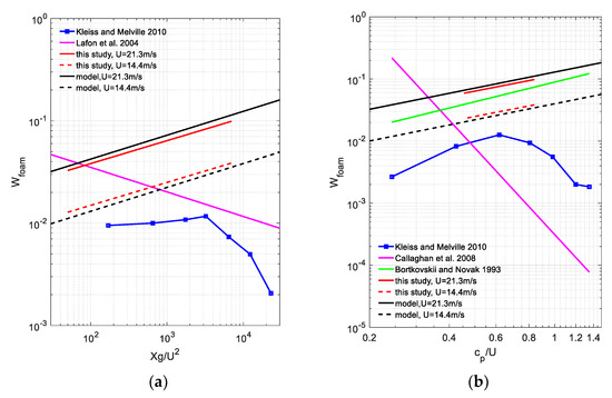 Second, Figure 8a,b show our parameterizations (10) and (12), respectively, in the ranges of parameters in which they are derived in this study. Note that disagreement in values with other data may be linked with different methods of wave breaking measurements. Additionally, the slope of dependency (13) on wave age is shown in Figure 8b. Model estimations (16) are shown for wind speeds of 14.4 and 21.3 m/s with the constant , selected to locate the curves in the considered ranges of .