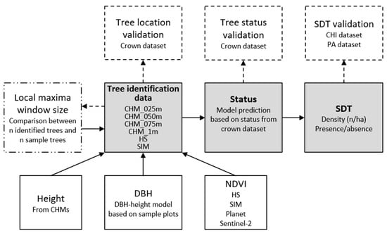SDT were predicted by identifying the location of trees from CHMs and optical data, respectively, and by predicting their status from NDVI values. The DBH of the identified trees was predicted from a diameter-height model. The density and the presence/absence of SDT were validated against the CHI and the PA datasets, respectively. An overview of the methodology is presented in Figure 2, which is described in detail in the following sections.