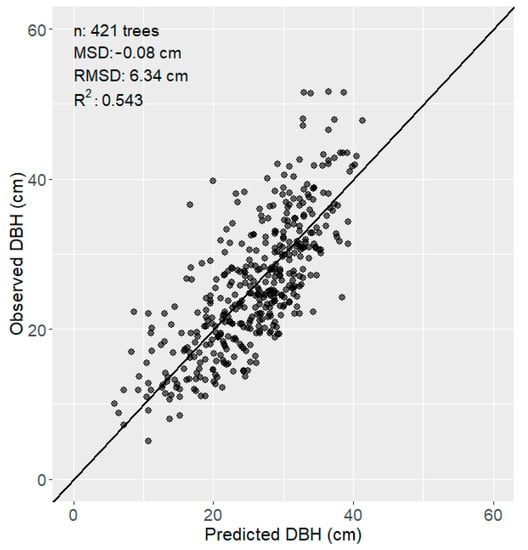 Figure 3. Scatter plot of observed and predicted diameter at breast height (DBH). n: number of sample trees; MSD: mean signed difference; RMSD: root-mean-square difference.