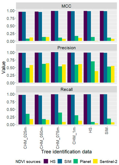 The performance metrics for the predicted status are presented in Figure 4. For the models using NDVI from aerial images (NDVIHS and NDVISIM), MCC values varied from 0.95 to 0.99, suggesting almost perfect predictions. The models using NDVI from satellite images (NDVIPlanet and NDVIS2) showed a low predictive power with values closer to zero. Precision values were larger for both NDVIPlanet and NDVIS2, 0.49 to 0.70 and 0.38 to 0.64, respectively, compared to recall values, 0.08 to 0.39 and 0.02 to 0.18, respectively, suggesting a larger omission rate than commission rate.