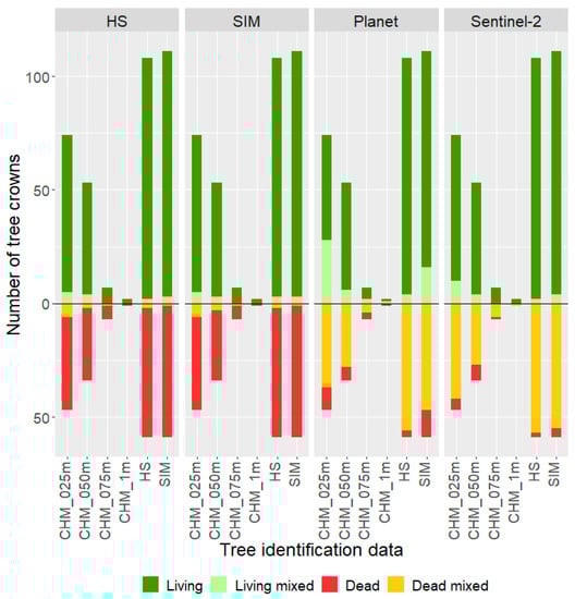 Figure 5. Status of trees located withing crowns detected with more than one tree. Living: living crown with only living trees; living mixed: living crowns with both dead and living trees; dead: dead crowns with only dead trees; dead mixed: dead crowns with both dead and living trees. The trees were identified using canopy height models (CHM) of 0.25 m, 0.50 m, 0.75 m, and 1 m spatial resolution (CHM_025m, CHM_050m, CHM_075m, and CHM_1m) and in hyperspectral (HS) and simulated aerial image (SIM).