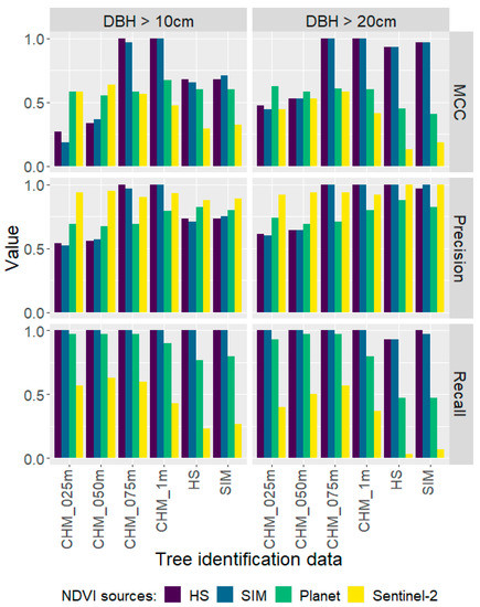 The predicted presence/absence of SDT was validated against the PA dataset (Figure 6). In general, the density of large dead trees (DBH > 20 cm) was found to be a better predictor of presence/absence of SDT when using NDVI from aerial images to determine the status. However, when using NDVI from satellite images, including dead trees of all DBH sizes (DBH > 10 cm), proved to be a better predictor. When combined with NDVI from aerial images, perfect predictions were obtained from trees identified in coarser CHMs datasets (≥0.75 m), and good predictions were achieved from trees identified in optical data, with MCC values ranging from 0.94 to 0.97 for large SDT and from 0.65 to 0.71 for SDT of all DBH sizes, respectively. The presence/absence of SDT was not predicted as accurately with NDVI from satellite images, with MCC values of maximum 0.67. While predictions from NDVIPlanet were similar for all tree datasets, NDVIS2 performed poorly when combined with trees identified in optical data. Figure 7 illustrates the magnitude of the commission errors from the different models by presenting the density of predicted dead trees in both the dead and living PA polygons. Trees identified in CHMs with coarse spatial resolution or in optical data predicted a low density of SDT in the living PA polygons and returned large precision values, implying a small commission error rate. This was also the case for models based on NDVIS2. Recall values were generally large, except with NDVIS2, suggesting a small omission error rate.