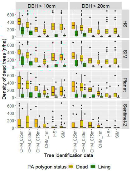 Figure 7. Predicted density of standing dead trees (SDT) in presence/absence (PA) polygons dominated by dead trees (dead) and living trees (living) for SDT with diameter at breast height (DBH) larger than 10 cm and larger than 20 cm. The trees were identified using canopy height models (CHM) of 0.25 m, 0.50 m, 0.75 m, and 1 m spatial resolution (CHM_025m, CHM_050m, CHM_075m, and CHM_1m) and in hyperspectral (HS) and simulated aerial image (SIM). The tree status was predicted using NDVI from HS, SIM, PlanetScope (Planet), and Sentinel-2 images.
