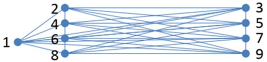 The basic VRP model is established as follows. A graph, G = (V, E), is constructed to transform the task assignment problem of the UAV network into a VRP. The node set V consists of the endpoints of each route and the UAV launch position. Each node in the graph is numbered sequentially; the field station is node 1, the starting point of the first route is node 2, and the endpoint of the first route is 3. Similarly, the starting point and endpoint of subsequent routes are numbered sequentially. The edge set E comprises all lines connecting the N nodes of the graph. All nodes are connected by edges to form the graph , as shown in Figure 2.
