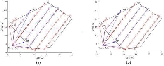 Furthermore, the constraints expressed in Equations (12) and (13) must be satisfied to prevent UAVs from conducting invalid operations and ensure the safety of UAV network observation. An invalid operation refers to the UAV’s flight across the designated route in its own mission area, which increases the UAV’s operating time and the number of invalid images. Therefore, the avoidance of route crossings should be considered in the task allocation process of UAV network observation. When the algorithm assigns tasks, the UAVs cannot fly across the area, and the flight routes must be adjacent to each other. Equation (12) is the constraint for the even number of routes, while Equation (13) is the constraint for the odd number of routes. The performance of the proposed VRP model is higher than that of the model proposed by Gustavo et al. (hereafter called the original method) because route crossing is prevented.