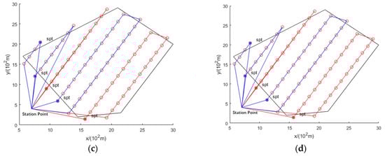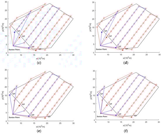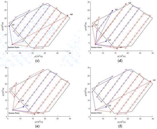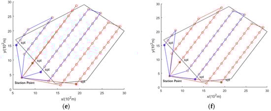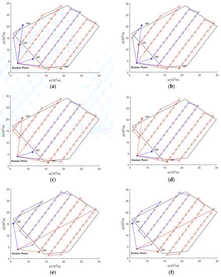 The path planning results of Method I (objective: minimum number of UAVs) and Method II (objective: minimum observation time). (a,b) results for Method I t for flight distances of 16.7 km and 13.3 km, respectively; (c,d) results for Method II for preparation time of 0.1 h and 0.2 h, respectively and a flight distance of 16.7 km; (e,f) results for Method II for preparation time of 0.1 h and 0.2 h, respectively and a flight distance of 13.3 km. (a) Method I; (b) Method I; (c) Method II, ; (d) Method II, ; (e) Method II, ; (f) Method II, .