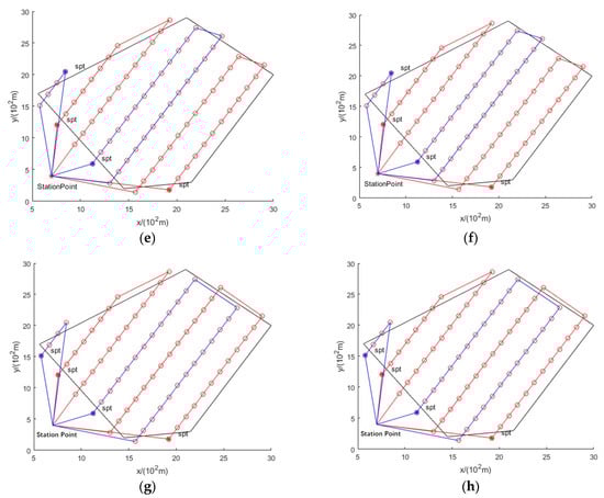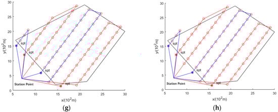 UAV network path planning results of the proposed method (a,b,e,f) and the original method (c,d,g,h) at a UAV flight speed of 7.5 km/h. (a,c,e,g) are the results derived from CPLEX, and the images in (b,d,f,h) are the results derived from Gurobi. (a) ; (b) ; (c) ; (d) ; (e) ; (f) ; (g) ; (h) .