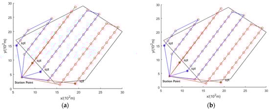 In single-UAV path planning, the initial step is to determine the flight direction of the UAV. Subsequently, the trajectory points and routes can be obtained. Additionally, the optimal starting point for the mission is selected. To determine the flight direction, the minimum span tree algorithm [33] is used to calculate the minimum span of the observation region polygon. The algorithm helps identify the optimal flight direction with the least number of turns for the UAV. Specifically, the vertices and edges corresponding to the minimum span of the observation region S are and edge , which determine the flight direction of the UAV. The optimal mission starting point is determined based on the relationships between the UAV field station and the observation area to ensure the shortest range of the UAV to and from the station.