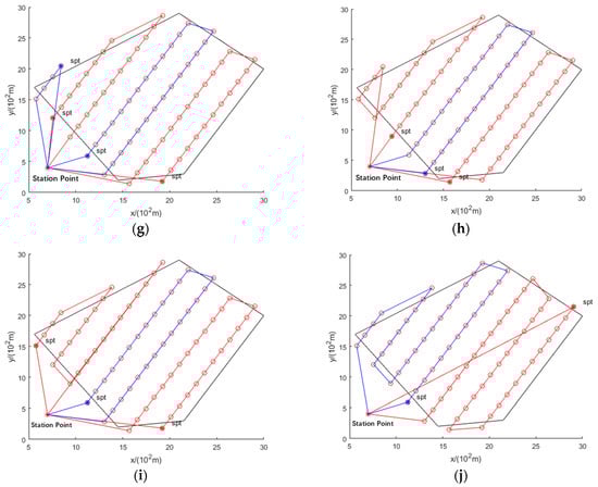 UAV network path planning results for different weights of the observation time and number of UAVs. The preparation time for each UAV is 0.2 h. The flight distance is 13.3 km in (a–f) and 16.7 km in (g–j). (a) a = 1, b = 0; (b) a = 0.9, b = 0.1; (c) a = 0.8, b = 0.2; (d) a = 0.7, b = 0.3; (e) a = 0.6, b = 0.4; (f) a = 0.5, b = 0.5; (g) a = 1, b = 0; (h) a = 0.9, b = 0.1; (i) a = 0.8, b = 0.2; (j) a = 0.7–0.5, b = 0.3–0.5.