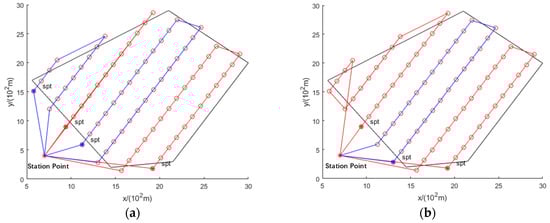 The UAV network path planning results of the proposed and original methods are illustrated in Figure 4 and Figure 5, respectively. The mission details, such as the flight speed, preparation time, and solver are listed in Table 1. Figure 4 and Figure 5 depict the results for UAV cruising speeds of 7.5 km/h and 6 km/h, respectively, and preparation times of 0.2 h and 0.1 h for both speeds. The routes of the neighboring UAVs are marked in red and blue, respectively, and spt is the starting point of each UAV. Based on the information in these charts, the following results were observed: