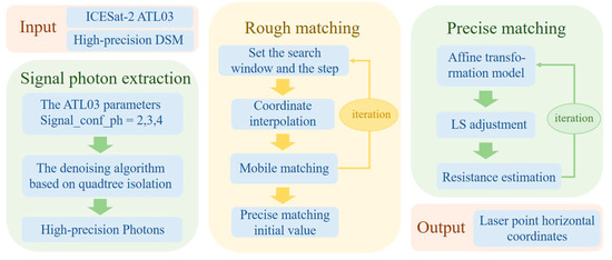The flowchart of the proposed method is shown in Figure 3, including signal photon extraction, rough matching, and precise matching. The official confidence label and the quadtree isolation (QI) noise removal method is used to preprocess the ATL03 data to obtain high-quality signal photons. The two-step terrain matching method is then employed to correct the photon coordinates. The proposed algorithm considers the deformation of GTs in rotation and scaling scales, thus having the potential to achieve more accurate matching positions between laser photons and the reference terrain.