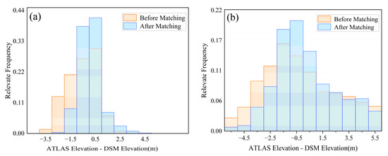 In Figure 8, most of the ATL03 photons are below the terrain profile before matching. The absolute value of the height difference between more than 80% photons and the reference terrain can be reduced to less than 1.5 m after coordinate correction. For RGT0390, the mean absolute value (MAV) before and after matching is 1.04 m and 0.64 m, respectively. For RGT0560, the MAV before and after matching is 2.64 m and 2.15 m. The matching of laser tracks and reference terrain in MDV shows better consistency.