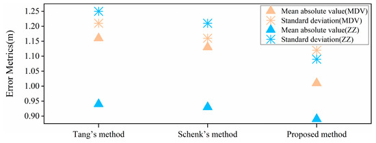 By comparing the matching results calculated by the three methods, it is not difficult to find that the proposed method can accomplish the best matching between photons and the reference terrain. The lower MAV and STD indicate that considering the deformation of laser tracks in terrain matching is necessary.