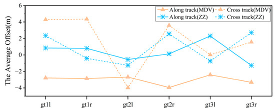 Due to the high accuracy of the selected DSM data (better than 1 m), the average offset can be used as its horizontal error. The average horizontal accuracy of the ICESat-2 laser tracks in MDV and ZZ is 3.86 m and 4.67 m, respectively. The horizontal accuracy of the whole dataset is less than 5 m, which is far lower than the theoretical positioning accuracy requirement of 6.5 m specified in official documents. Additionally, the offset variations along the track direction of different beams are stable. The offset across the track is relatively large, caused by the laser altimetry’s working mode. Table 4 shows that the results obtained by the proposed method are the same as those obtained by the other two methods. This consistency further proves the effectiveness of the proposed method.