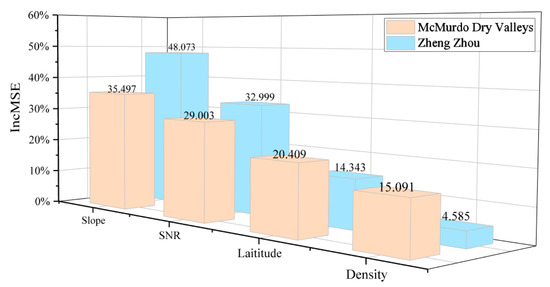 The RF model performed well in multivariate data analysis. The increased mean square error percentage (%IncMSE) provided by it can effectively reflect the relative importance of different variables [34]. The %IncMSE is the average increment of the contribution of a variable to the mean square error divided by the variability. The higher the %IncMSE, the more crucial the variable. It is worth noting that due to the limited explanatory power of the regression model, we mainly focus on ordering the variable %IncMSE values rather than their proportions [35]. Figure 11 indicates that slope is the primary factor affecting the positioning accuracy of ICESat-2, followed by SNR. Latitude and photon density can also have little impact on location accuracy.
