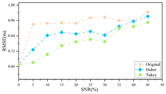 We select a laser photon track and add noise photons to compare the matching results with different equivalent weight functions. The matching result without noise photons is considered the true position of the laser track. As shown in Figure 13, without robust estimation, the matching result deviates significantly from the true position when the SNR is 5%. This indicates that noise photons can easily affect the least square method. As the SNR increases, the error of the matching result tends to be stable, and the RMSE remains around 1 m. After using the equivalent weight function, noise interference on the matching result is significantly suppressed in the case of fewer noise photons. Especially when the SNR is less than 10%, the suppression effect of the Tukey function is particularly obvious. The SNR of denoised data can be kept below 10%. This indicates that the adjustment result can effectively reduce the effect of noise photons after using robust estimation.