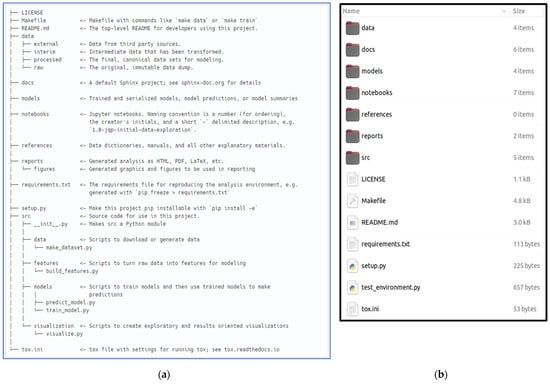 (a) Screenshot of the directory structure of the Data Science Cookiecutter Template []; (b) Data Science Cookiecutter Template as rendered in a local development environment.