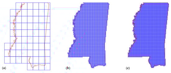Final converted grid cell polygons laid onto a region shapefile: (a) GRACE grid cells dimensions and locations; (b) CHIRPS grid cells; (c) TerraClimate grid cells.