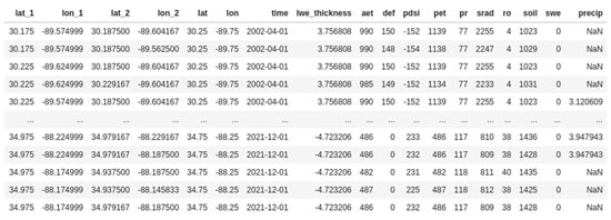 The lat_1 and lon_1 columns are the grid cells corresponding to the CHIRPS dataset, the lat_2 and lon_2 columns are the grid cells corresponding to the TerraClimate dataset, and the lat and lon columns are the GRACE grid cells. The first six lines highlight the unique values of the CHIRPS values, while the other grid cell values remain constant. The lwe_thickness is the GRACE dataset value; this is the output variable for the training da-taset. The aet, def, pdsi, pet, pr, srad, ro, soil, and swe are from the TerraClimate dataset and are a significant portion of the input features for the model training dataset. Finally, the precip column, which is another input feature for the model training dataset, is derived from the CHIRPS dataset. The TerraClimate dataset has the highest resolution and drives most of the variability for generating the downscaling model.