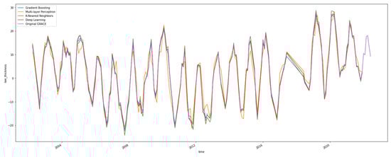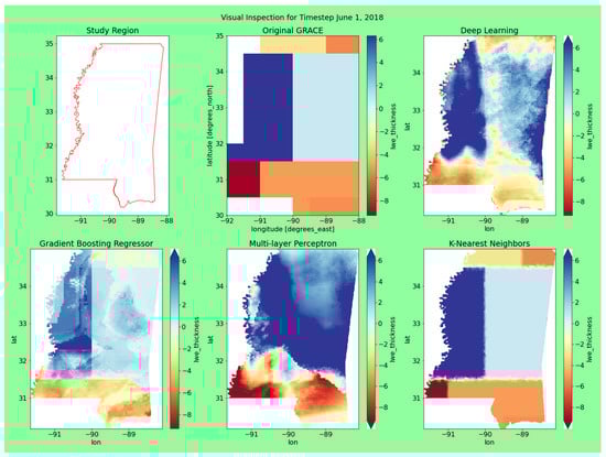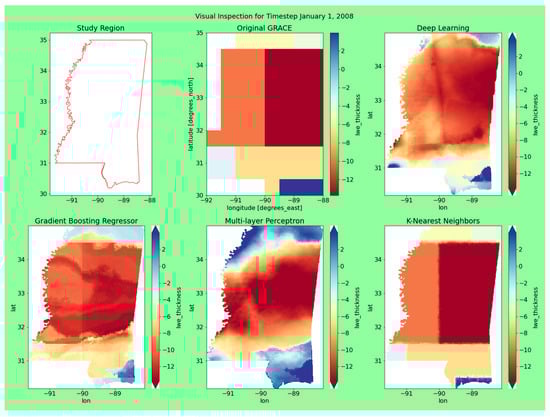 Validating the downscaled GRACE TWS dataset is challenging due to the lack of a comparable observed dataset. Thus, the next best validation methodology was to observe the variations in the timeseries generated at the regional level. This helps in evaluating the changes in conservation of mass at the regional level []. For each model, a timeseries value per timestep was generated by applying a mean across the grid cells. The timeseries chart for the models, along with the original GRACE data, is shown in Figure 6. For certain timesteps, the models underpredicted the original GRACE dataset, and for others they overpredicted the GRACE values. There are no discernable patterns on the model output results; however, all the models followed the general trend of the underlying GRACE dataset very well.
