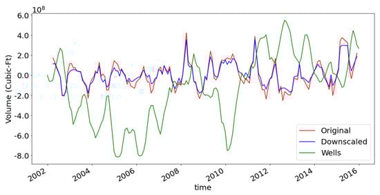 Using the methods implemented in the GRACE Groundwater Subsetting tool (GGST) and the Groundwater Data Mapper (GDM) [,,], the groundwater storage volume timeseries was generated for Sunflower County, MS. The aquifer storage coefficient for generating the groundwater storage volume was derived empirically. The time period for analysis was from 2002 to 2016, to account for outliers. The derived storage volume, GRACE data, and DL downscaled storage volumes are shown in Figure 8.