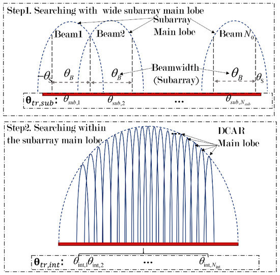 Since the beams are periodically repeated in the inter-array pattern, the DCAR search can be decomposed into two steps, namely inter-array and intra-array search for simplicity. The intra-array search provides a rough coverage of the search area with the wide beams of the subarray. In this step, we calculate the inter-array search weight vectors corresponding to . Different subarrays share the same set of weight vectors. Then, we search with the narrow inter-array beam in the range of the wide beam. The inter-array weights are solved for as shown in Figure 5. The same inter-array search weights can be used for different subarray wide beam pointings. Importantly, if we need to point out that what we call step-by-step here actually refers to a fast beamforming weight calculation method, rather than a real scanning process.