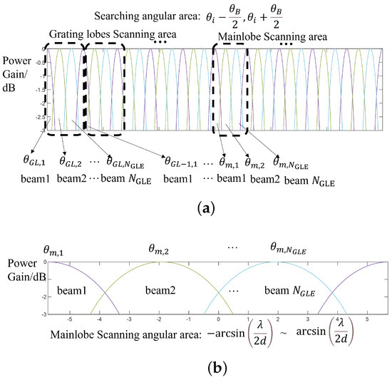 GLE scanning: (a) main lobe searching area power gain; and (b) searching area power gain (including main lobe and grating lobes).