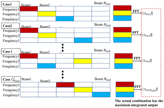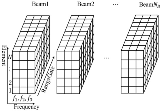 The principle of multi-frequency DOA ambiguity-solving is similar to multi-frequency Doppler ambiguity-solving or communication delay ambiguity solving [44]. Assuming that the frequencies are and the frequency varies with pulses periodically repeated. The received data are noted as , where is a multi-dimensional matrix corresponding to the pulse frequency, array element, and range cell, respectively. The data matrix format is shown in Figure 7, where the data at each frequency are noted as , and .