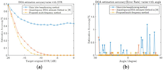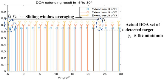 The period extension results corresponding to a wrong hypothesis are given in Figure 18b, and the periodical extension results for the real hypothesis of the targets are shown in Figure 18c,d. The results for different period extensions also show that the multi-hypothesis approach avoids the situation where two targets are close to each other at the same frequency. Therefore, the accuracy of the multiple hypothesis method for multiple targets estimation will be higher than that of the method that directly performs period extension and sliding window averaging detection for all ambiguous DOAs.