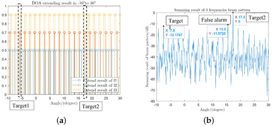 Comparison of the proposed method and the method of summing DBF results: (a) DOA extending result; and (b) different frequency pattern summing result.