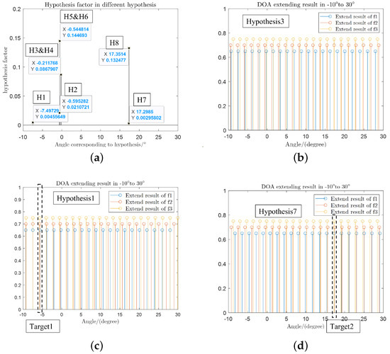 Multiple hypothesis factor and extension results: (a) DOA set factors of 8 hypotheses; (b) wrong hypothesis result; (c) extension results for target 1; and (d) extension results for target 2.