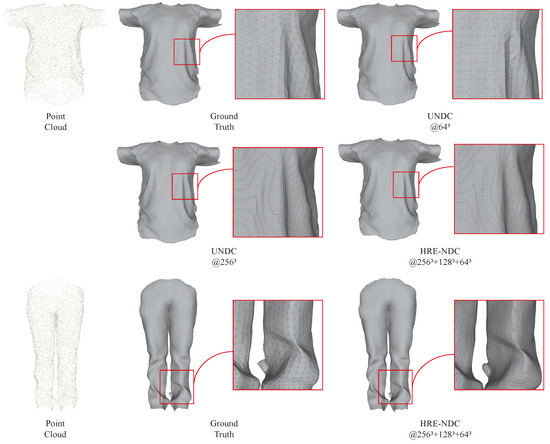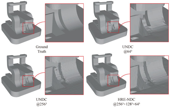 We first demonstrate the comparison results with the baseline to verify the efficiency and improvement of HRE-NDC for sharp edge details. Figure 8 and Table 2 show the reconstruction results of three scales () of HRE-NDC and UNDC () with the same resolution; the objects shown in Figure 8 are all from the test set of the ABC dataset. It can be seen that although UNDC has produced decent reconstruction models, there are still issues with holes, artifacts and jagged edges on the boundary (as indicated in the red box in the figure; please zoom in to examine the specifics). Due to the coarse-to-fine structure of HRE-NDC and improvements targeting boundary details (residuals + activation), our method achieves better reconstruction quality, especially in sharp edge reconstruction. More importantly, our method significantly shortens training time.