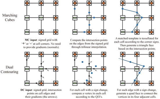 Marching Cubes (MC) [14] and Dual Contouring (DC) [24]. The blue dots represent intersection points in MC and vertices in DC.