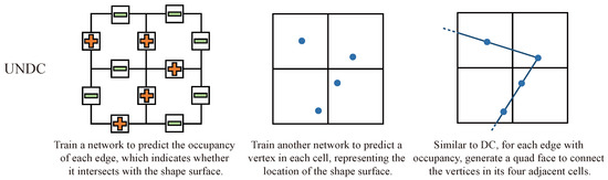 NDC or UNDC [10], as the most recent state-of-the-art method, basically follows the insights summarized in Section 2.1. Its network structure is shown in Figure 3, which uses a PointNet++-like [32,33] encoder to extract local neighborhood features from the point cloud. These features are then projected into a fixed-resolution cubic feature grid represented as . The authors default to using a 32 or 64-grid resolution, which means that the cubic grid has or cells. To further aggregate and extract features from , NDC uses a 3-layer 3D-CNN followed by a 2-layer fully connected layer, serving as the prediction head. This head predicts a vertex and a signed edge in Figure 2 (bottom) within each cell, which is represented as . Through supervised training, the network is able to make its predictions approach the targets . Finally, the resulting discrete grid with predicted and values can be transformed into an explicit mesh using the Dual Contouring (DC) algorithm outlined in Section 2.2 and Figure 2.