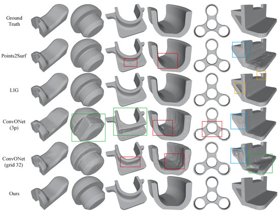 Convolutional Occupancy Networks (ConvONet) [9] proposes two networks that use 2D-CNN and 3D-CNN, respectively named ConvONet-3plane (shown as ConvONet-3p in the Figure 9) and ConvONet-grid (shown as ConvONet-grid32 in the Figure 9, with a default resolution of ). We compared the performance of both models. The 3-plane network is more efficient but has inferior representation capabilities, which may lead to artifacts in the reconstruction results, as depicted by the red boxes. The grid model has better representation capabilities but is relatively less efficient. Additionally, since ConvONet uses one latent vector to represent one object, it may make semantic recognition errors and may not be as local as Points2surf or LIG, as shown by the green boxes. Finally, it also struggles to represent open surfaces and hollow holes well, as indicated by the blue boxes.