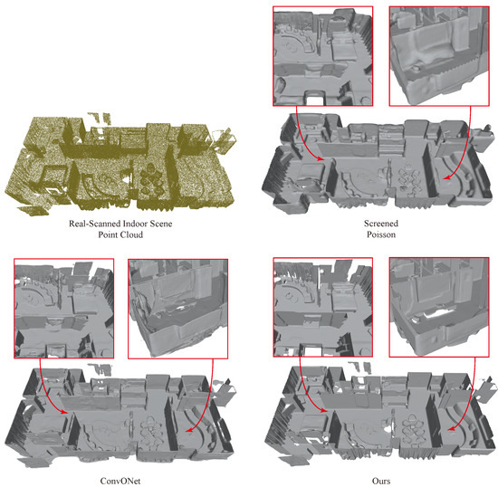 Specifically, as shown in Figure 10, we compared our method with the commonly used traditional reconstruction method Screened Poisson (SCP) [25] and the recent outstanding learning-based method ConvONet [9]. From the enlarged detail map, we observe the following: (1) SCP relies on the input normals to differentiate between inside and outside in the local area, rather than an “unsigned” representation, which can lead to deformation. ConvONet may reconstruct better in one direction due to the utilization of an assumed reference plane, while other directions may yield inferior results. This can be seen in the bottom left of Figure 10, where the effect on the vertical ground direction is fine, while the effect on the wall is worse. Our method uses an “unsigned” representation and achieves relatively the best scene reconstruction effect. (2) SCP and ConvONet both employ Marching Cubes [14,15] to generate meshes, which can result in insufficiently sharp boundary representation. Our method employs Dual Contouring [24] to produce meshes, thus yielding higher-quality boundaries in the generated results.