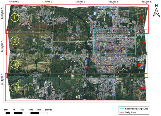 Thumbnails of four experiment strips (UTM Zone 50N). The red arrows indicate the relative flight directions of the strips. These strips are indexed from north to south as the first, second, third, and fourth strips, respectively. Meanwhile, the blue rectangles denote the locations of the three calibration strips for reference. The numbers encircled indicate the indices of the strips.