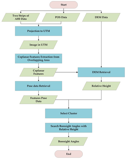 The pushbroom hyperspectral imaging system consists of two main subsystems, namely the imaging subsystem and the Inertial Measurement Unit (IMU) sensor. The IMU sensor plays a crucial role in recording pose and motion data of the system. However, it is unable to provide the relative pose with respect to the imaging subsystem, particularly the boresight angles. To address this limitation, we make an assumption that the boresight angles remain constant during an observation task. This section presents a detailed account of the proposed method, and a flow chart depicting the workflow is presented in Figure 2.