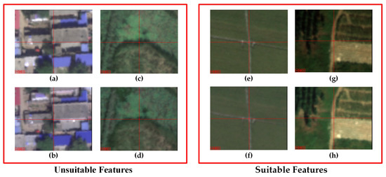 The suitable features and unsuitable features in boresight calibration. (a,b) are unsuitable as they are related to height, and are averaged at the low-resolution DEM datasets. (c,d) are unsuitable due to their relationship with shadows. (e–h) are suitable features that are not influenced by height or shadows.