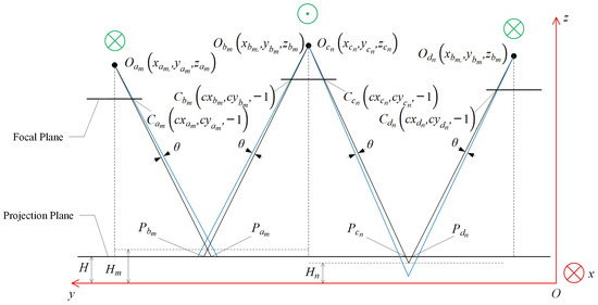 Schematic diagram of the projection error of feature pairs in adjacent strips. Coordinate reference system is drawn in red lines and the origin is set at O. Circles with dots or crosses denote the flight direction towards outside or inside the paper. , and , and are four optical centers of two feature pairs in their corresponding strip frames. , and , and are normalized intrinsic parameters. , and , are projection points in projection plane H. and are the true projection planes of two feature pairs. Blue lines denote the influence of perturbation on roll angle to projection lines. is the perturbation of roll angle.