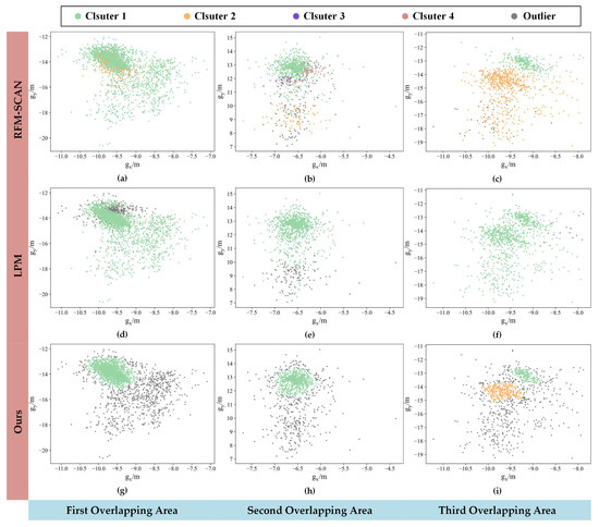 According to Equation (3), Figure 5 shows the distribution of Euclidean distance difference vector set G in different overlapping areas. As observed, there is at least one cluster in each overlapping area. The objective is to select these cluster points and determine their centers. Density-based spatial clustering of applications with noise (DBSCAN) [48] was utilized to select the clustering points, given that points in clusters are denser than those around the border. The parameters used were and . The clustering results were then compared with other feature matching methods, such as LPM [49] () and RFM-SCAN [50] (). The proposed method could distinguish the clustering points from other feature points.