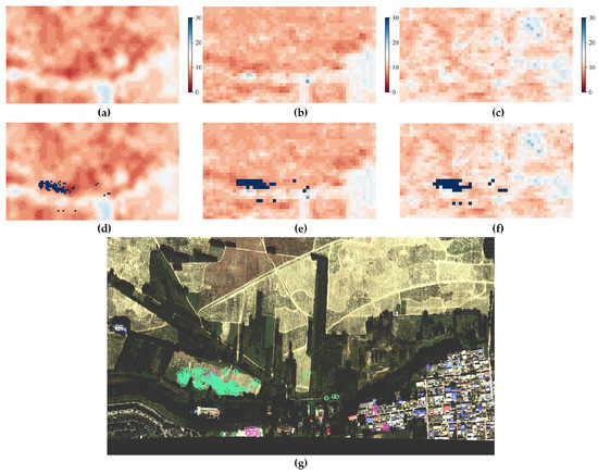 Part of DEM retrieval results of cluster 2 (in Figure 5i) from three DEM datasets. (a) DEM data of SRTM-GL1. (b) DEM data of AW3D30. (c) DEM data of ASTER GDEM V3. (d–f) The dark blue pixel blocks are the position of the feature points in the corresponding DEM datasets. (g) The position of the feature points in the third strip image. The green marks are part of the feature points of cluster 1 in Figure 5i. The pink marks are part of the feature points of cluster 2 in Figure 5i.
