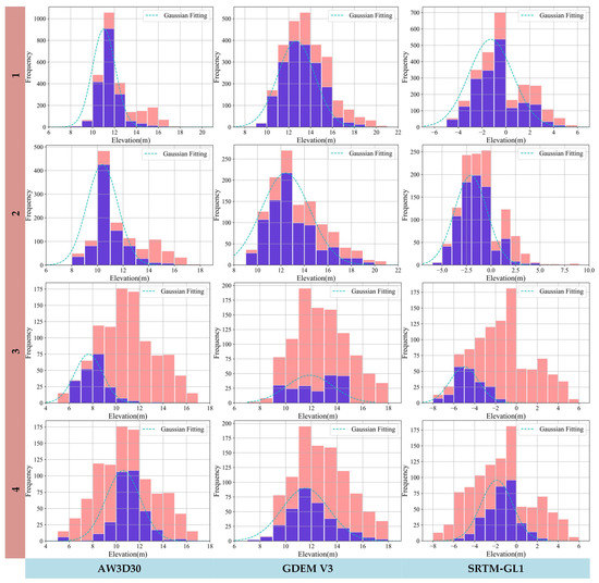 The histograms depict the distribution of feature points across different regions and DEM datasets. Red bins represent all features, blue bins represent selected features with similar disparity, and sky-blue dotted lines represent Gaussian fitting results using the elevation data of selected features. Number 1 to 4 denote the cluster indices in Figure 5.